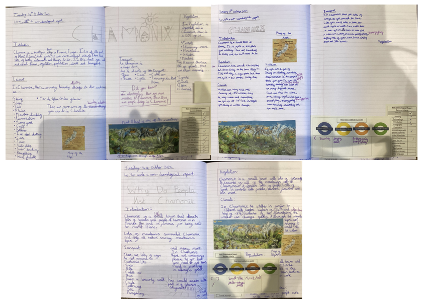 In English, we’ve been working on non-chronological reports all about Chamonix, a beautiful town nestled in the French Alps. Pupils researched its geography, climate, and attractions, then structured their writing to inform and engage readers. We focused on using formal tone, clear headings, and interesting facts to bring our reports to life.