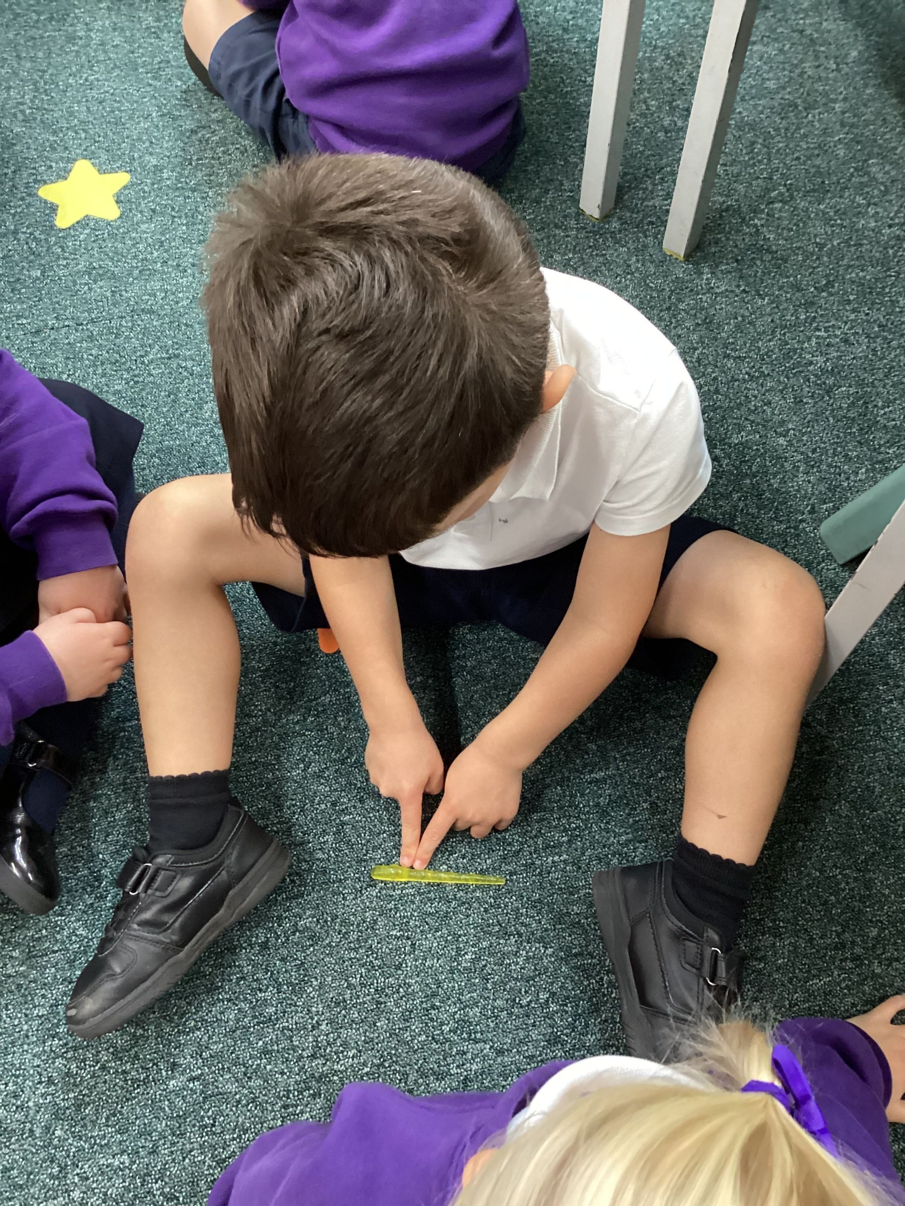 In Maths, we spoke about length and height using words like tall/short and long/short. Then, we have been using body parts to carefully measure length and height. No gaps, no overlaps and count as we go.
