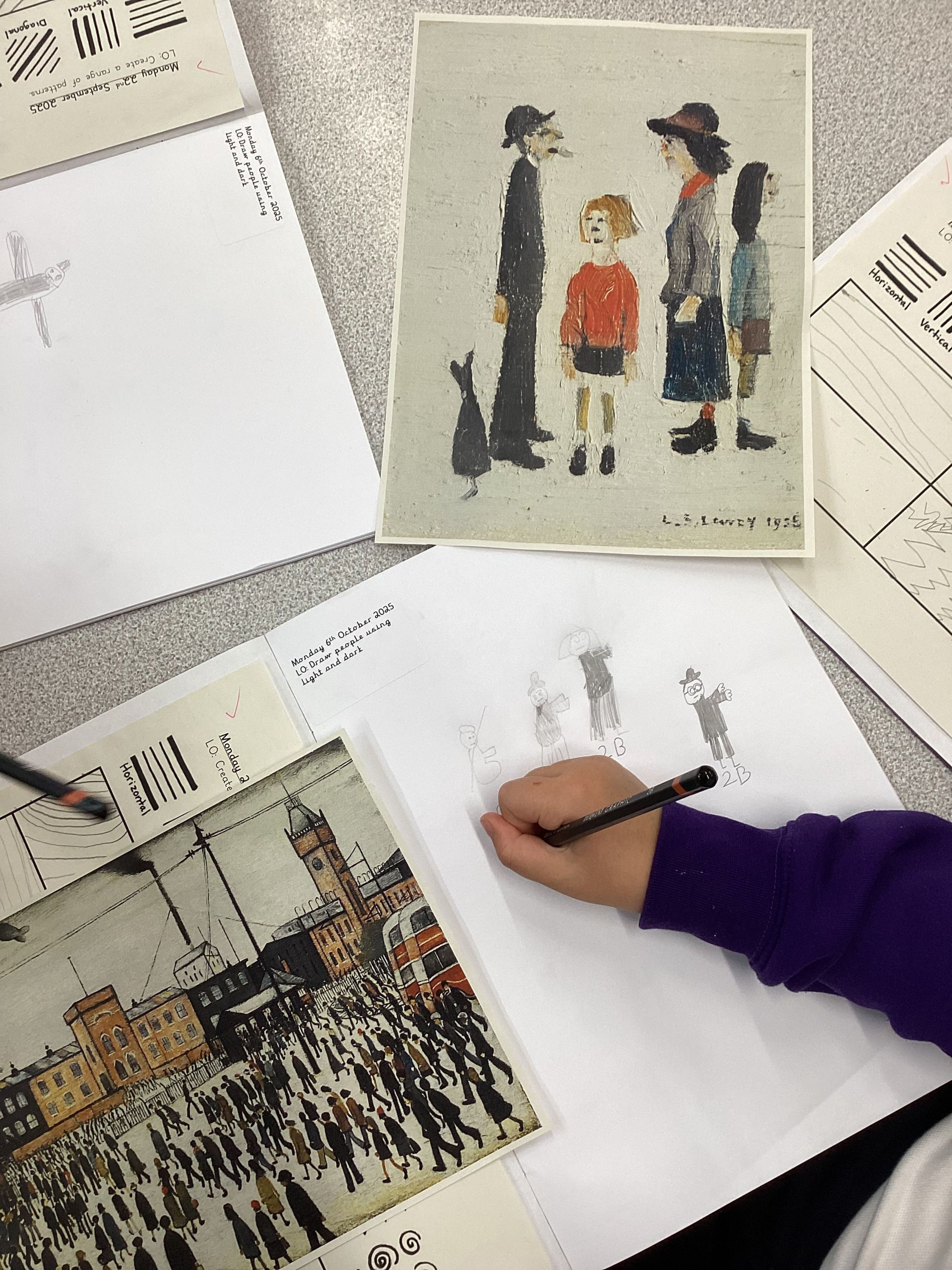 In Art, we have explored how Lowry represents people in his artwork. We had a go at drawing people and dogs in the style of Lowry.
