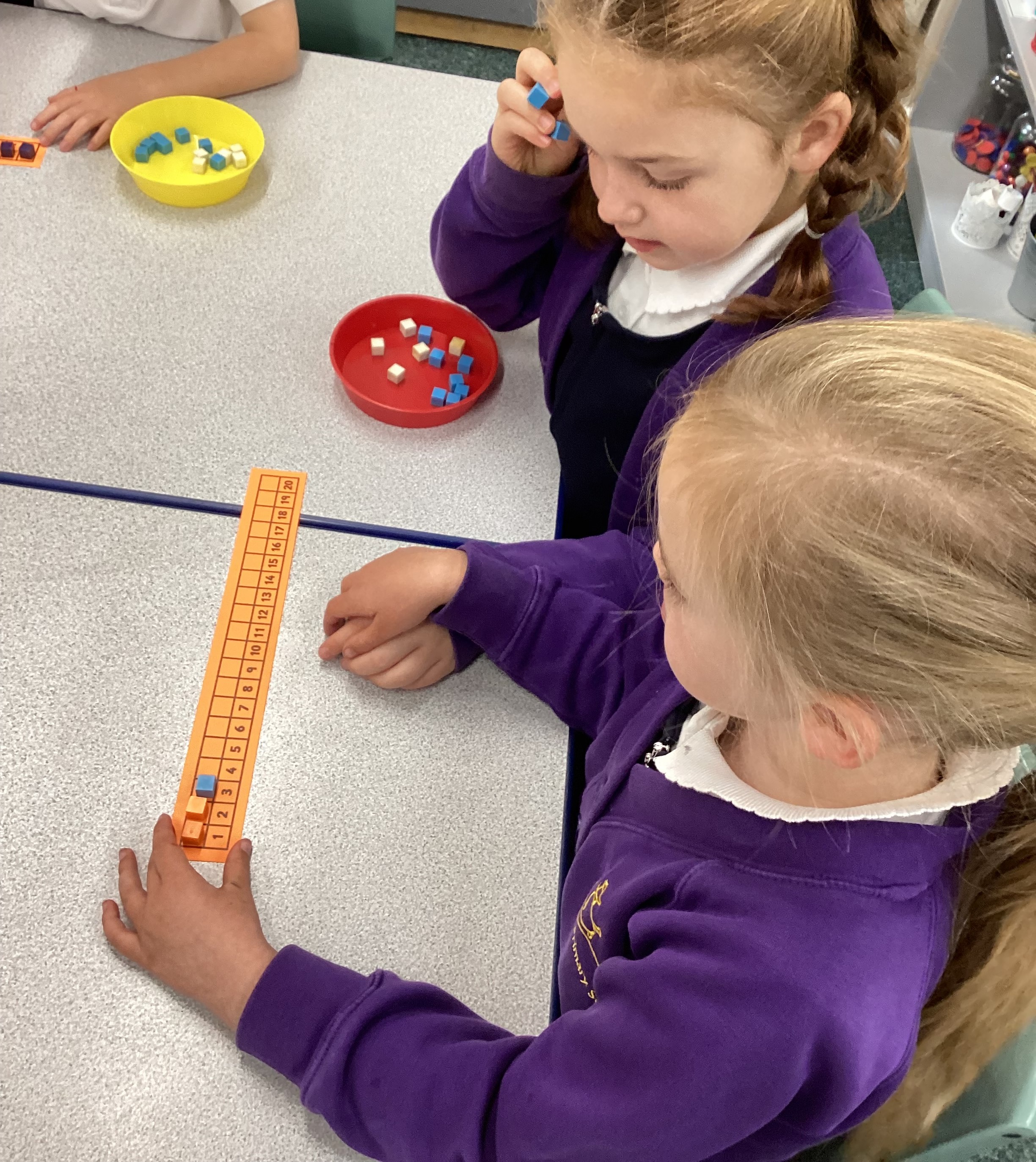 In Maths, we have been using a number track and practical equipment to find one more and one fewer than an amount.
