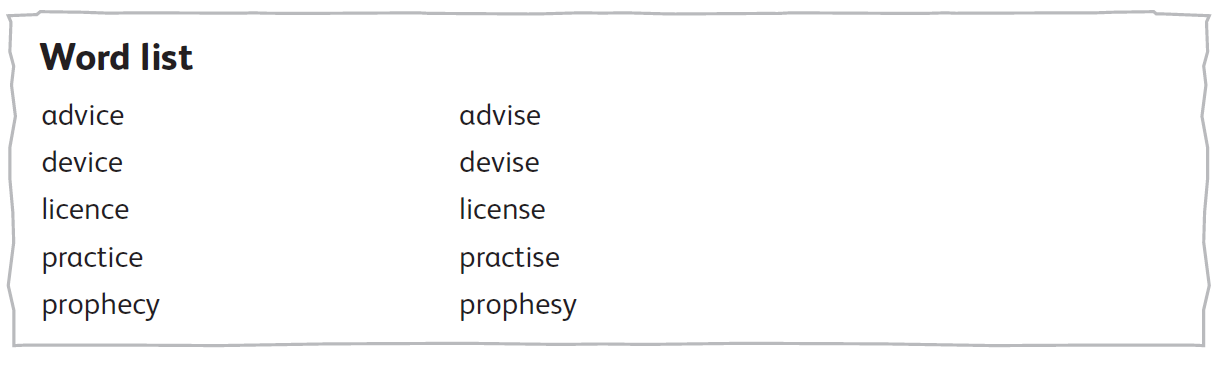 This week's spellings focus on homophones and near-homophones. The five pairs of words differ by a single letter (‘c’ or ‘s’) depending on whether they are used as a noun or a verb.