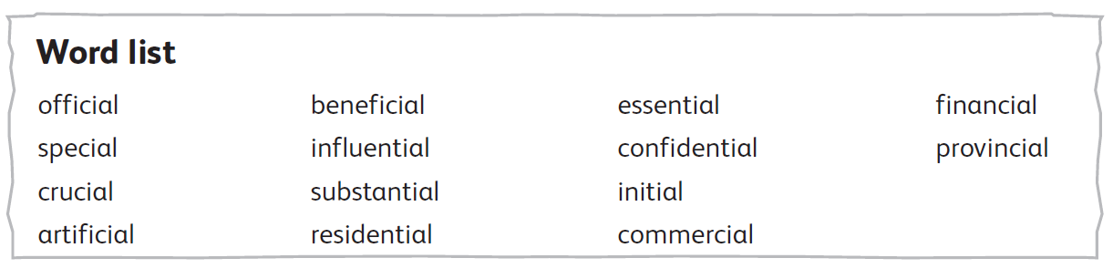 This week, we’ll focus on words ending in -tial and -cial. Most of these words will be familiar, but the tricky part is knowing which ending to use.