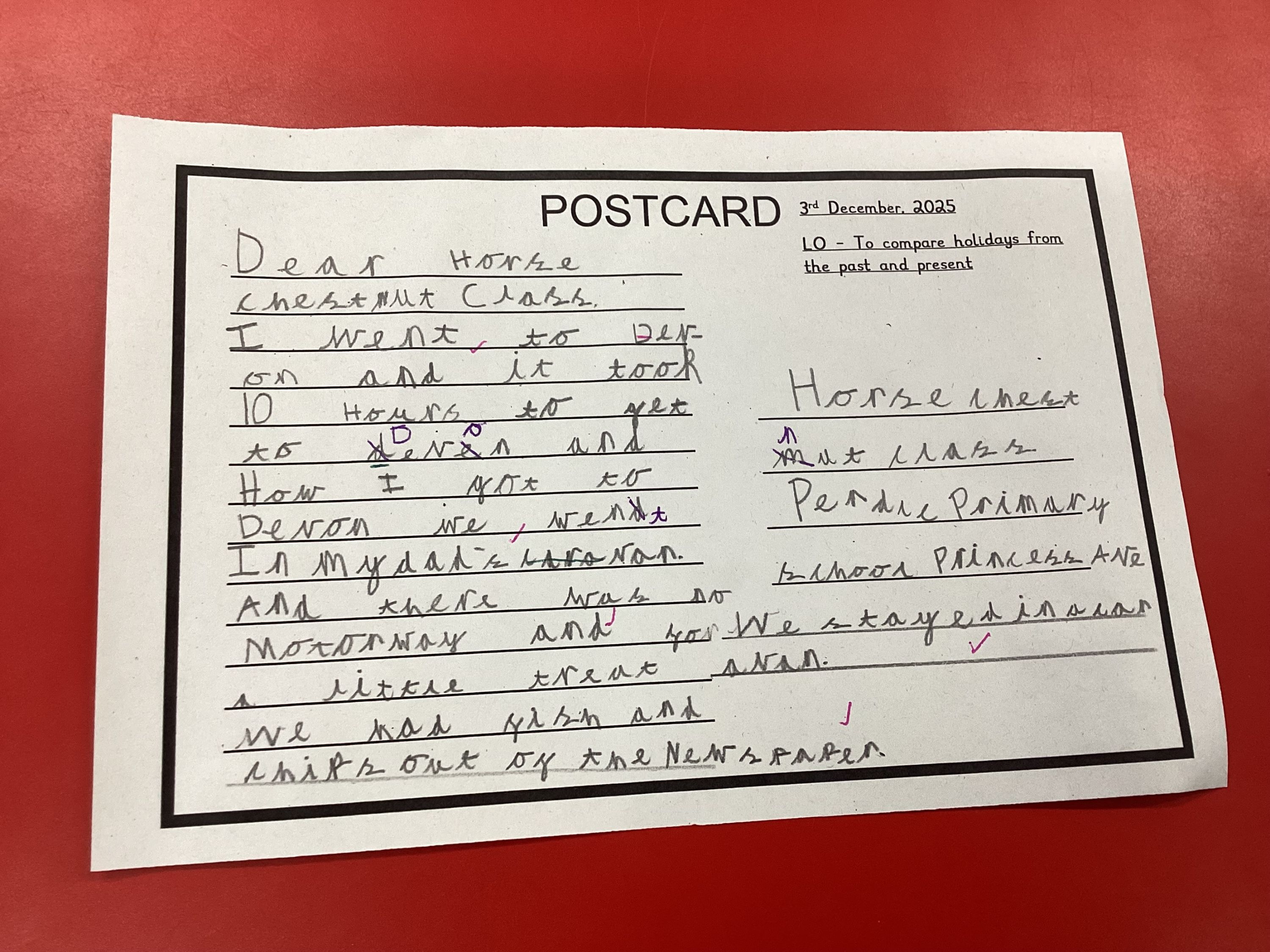 In History, we wrote postcards in role as Mrs Nunns. We remembered all the facts she shared about her past holidays when she visited.
