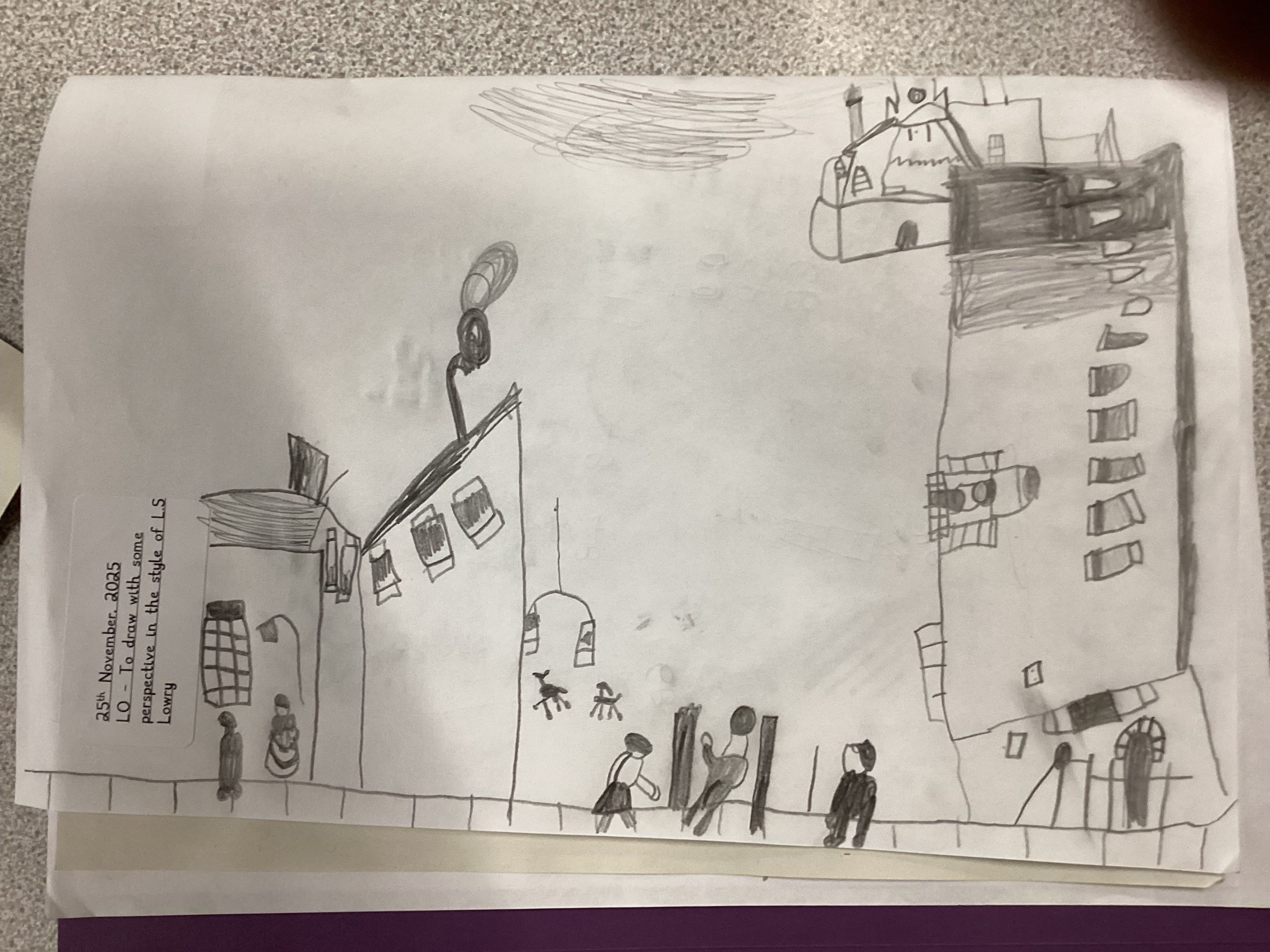 We are studying the artist L. S. Lowry in Art. We worked collaboratively to draw buildings in his style, using tone and shade with sketching pencils.