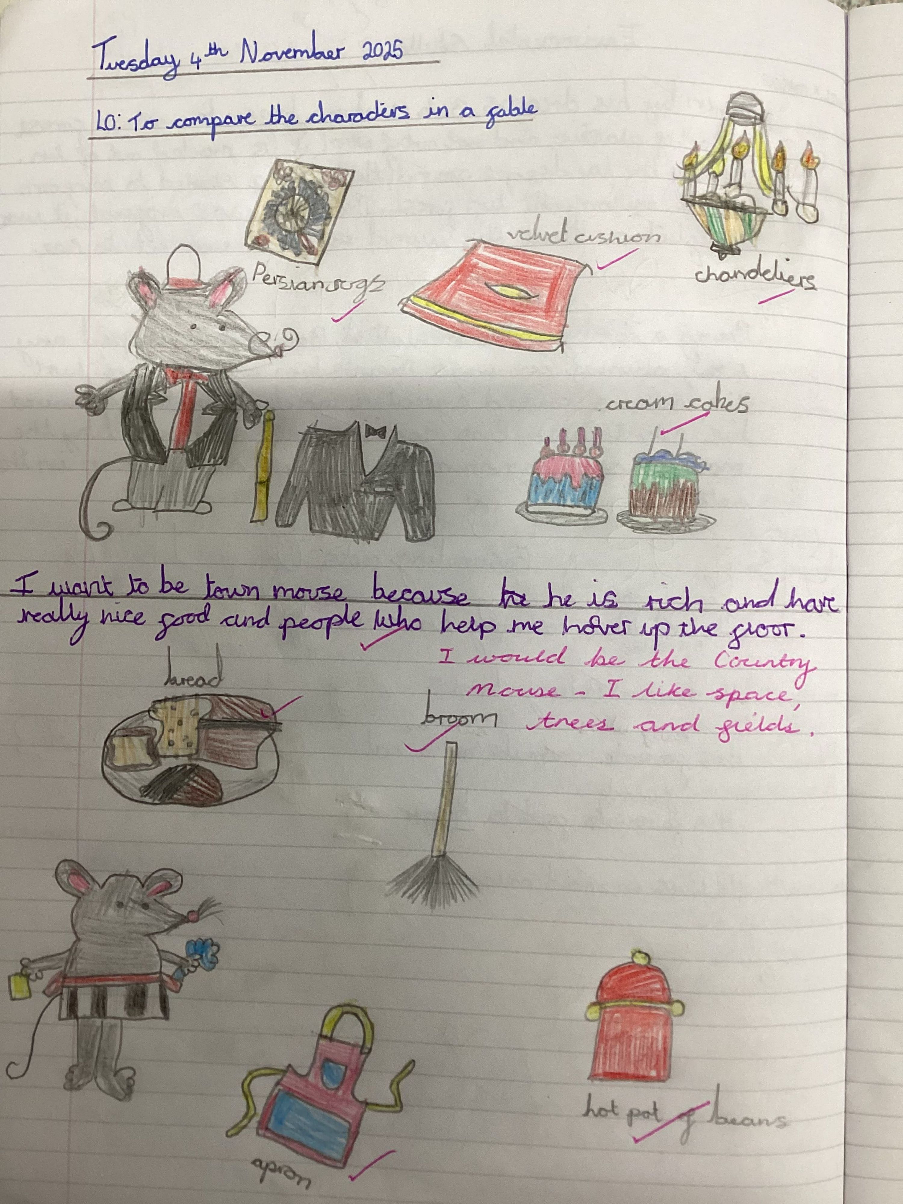 In English, we have been studying Aesop’s fables, exploring the lessons and morals they teach through simple stories. After reading several fables, we focused on “The Town Mouse and the Country Mouse,” comparing the two characters in detail. We discussed their different lifestyles, personalities, and choices, and thought about what each character values most.