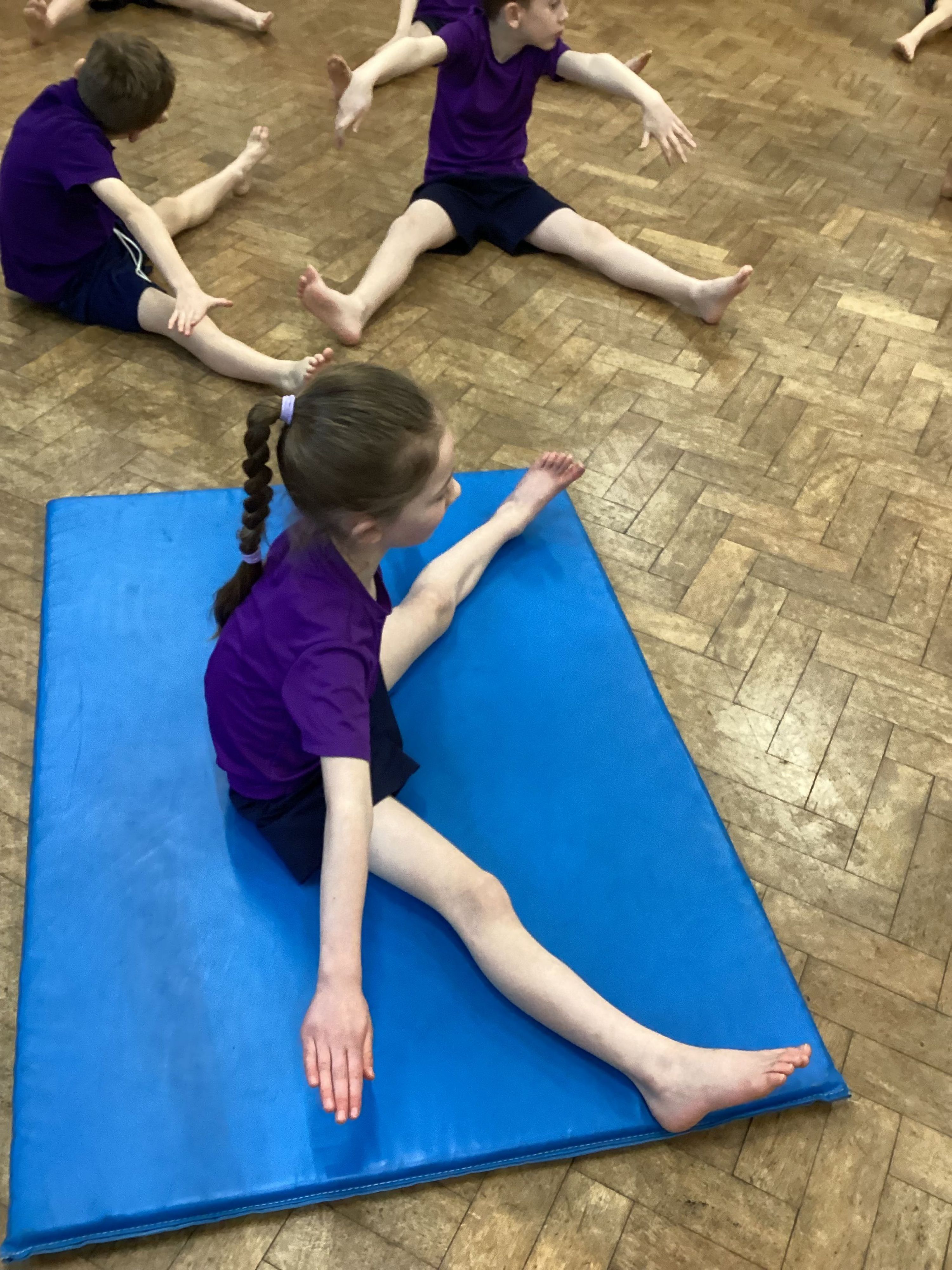 In PE, we stretched our muscles, practising straddle shapes and crab walk and bear walking.