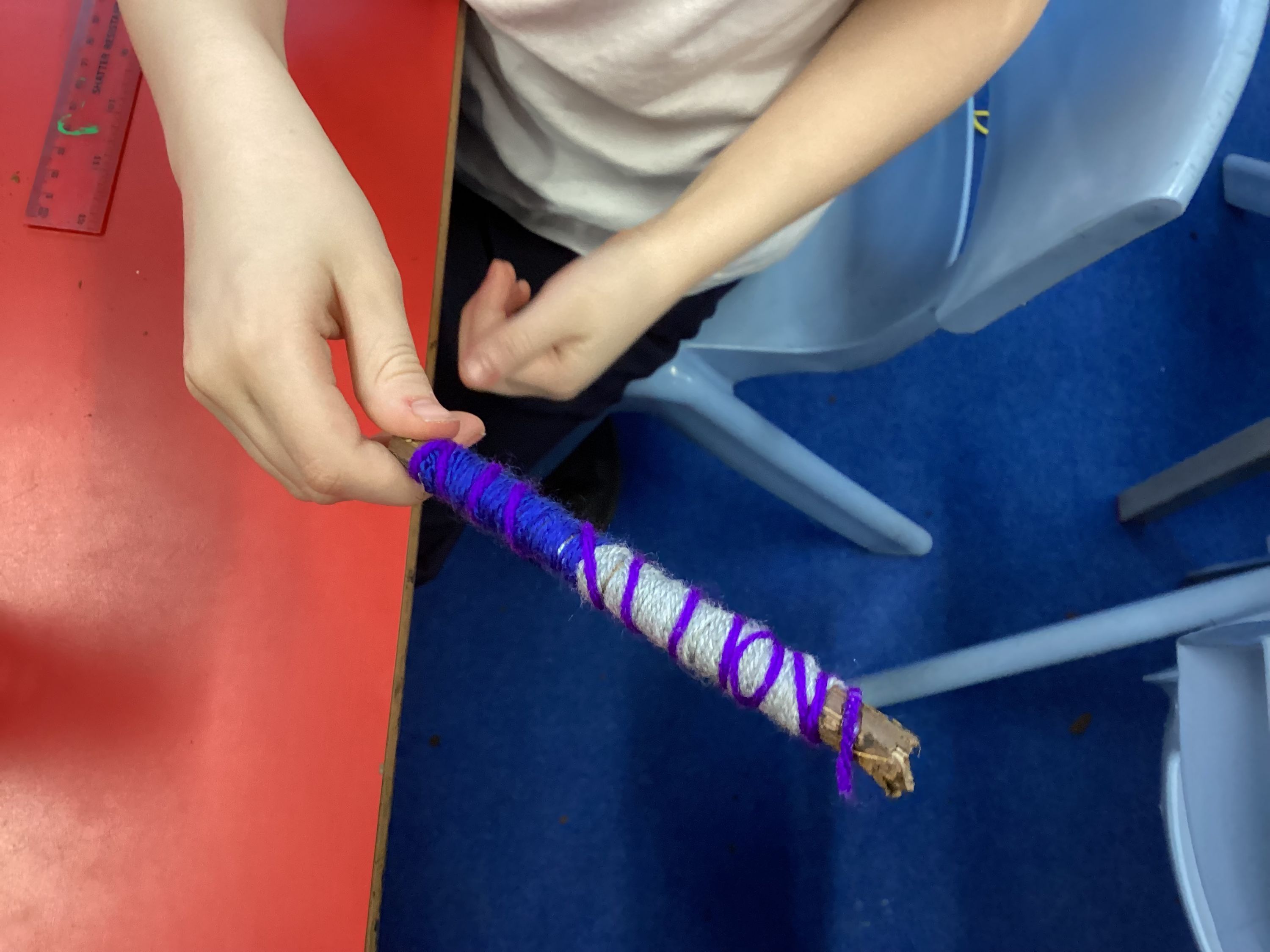 In Art, we chose and measured 90cms of wool in order to create our wool wrappings around a twig and a piece of card.