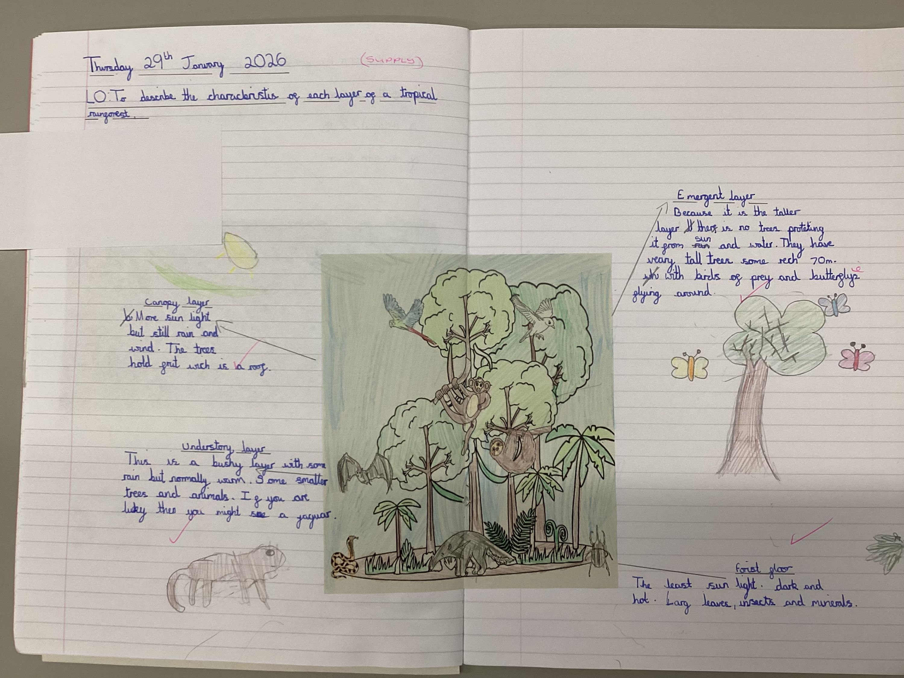 In Geography, we have been finding out about the different layers of the rainforest and the wildlife that live in each one. The children learnt how the forest is made up of the forest floor, understory, canopy and emergent layer, and explored how each layer provides a unique habitat. They enjoyed discovering the incredible variety of animals that live there—from insects on the forest floor to birds and monkeys high in the canopy—and how each species is specially adapted to its environment.
