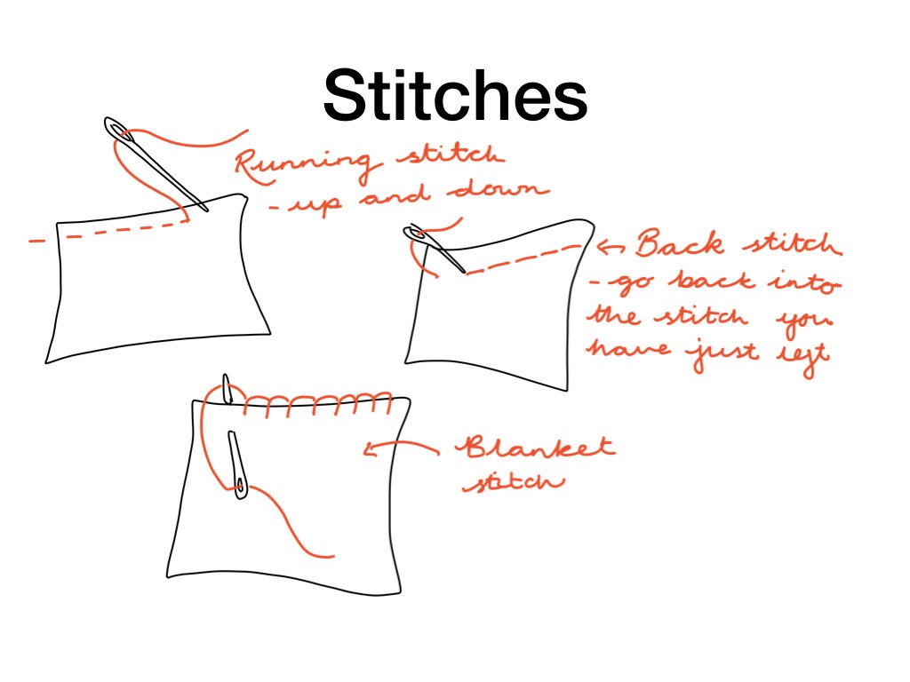 With an adult, revise the following sewing skills on a piece of material – running stitch, back stitch and blanket stitch.