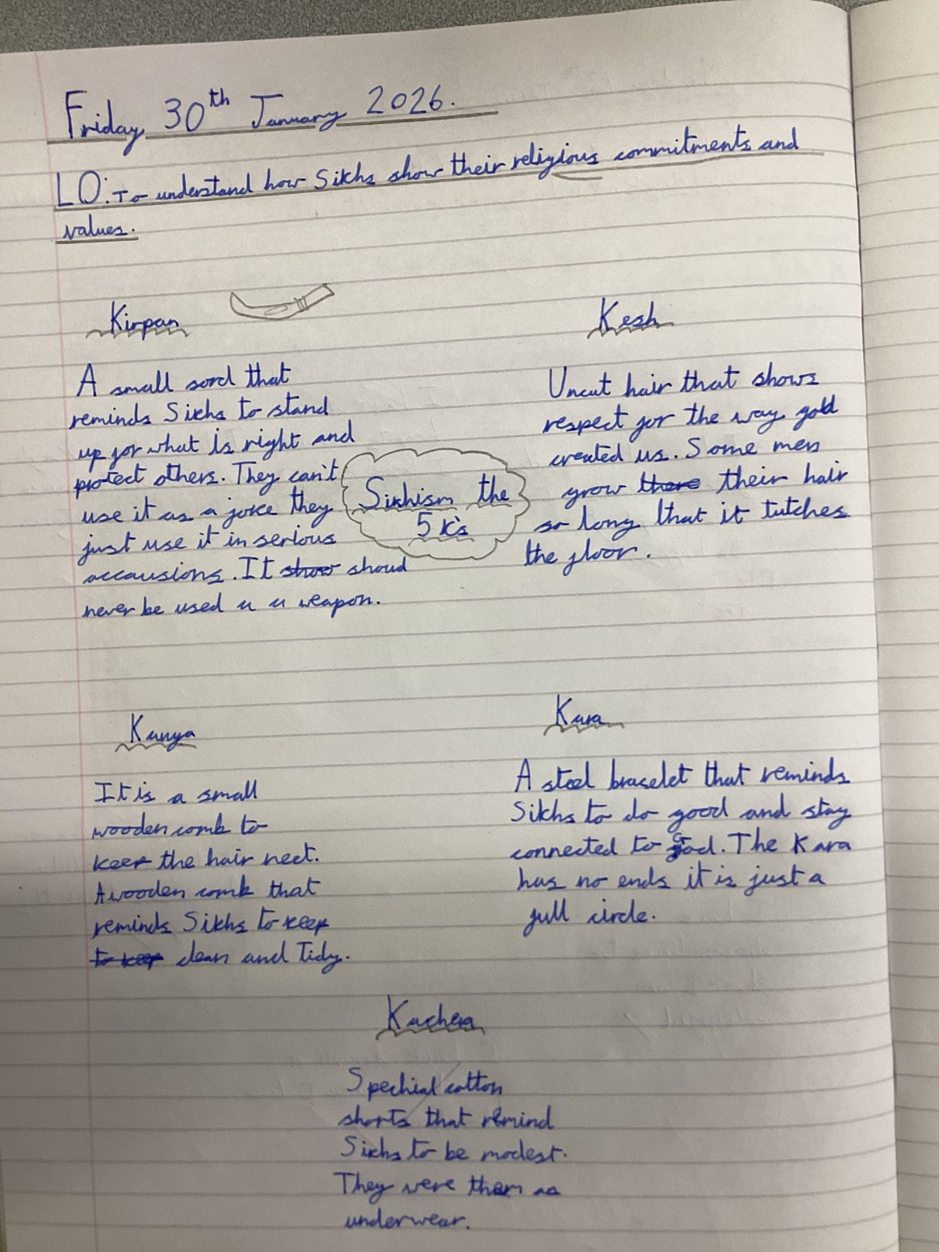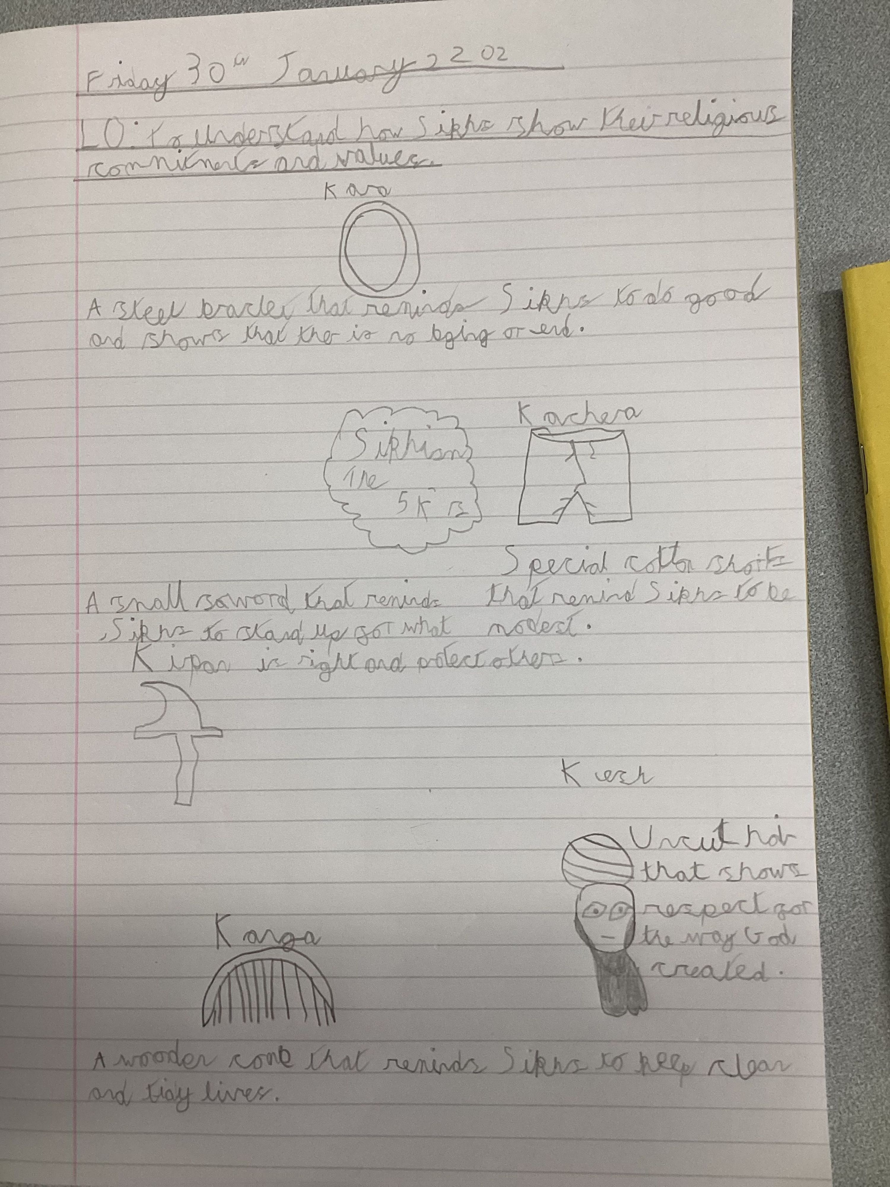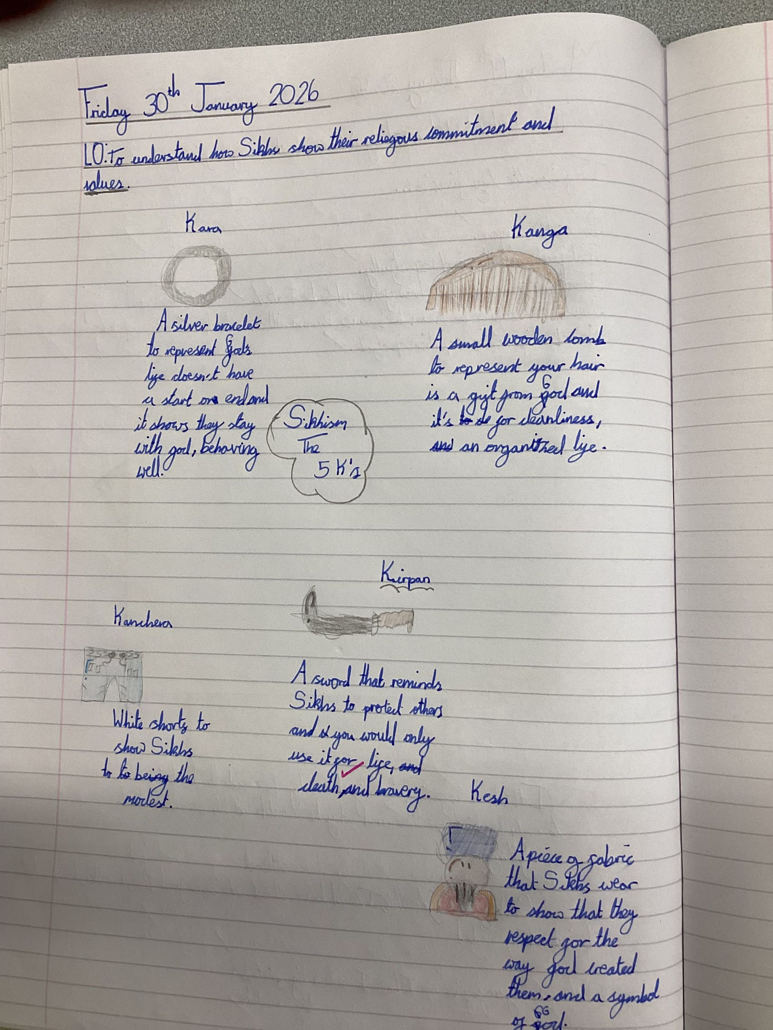 In RE, the children have been learning about the significance of the Five K’s in Sikhism. We explored what each of the Five K’s represents and why they are important to Sikhs today.