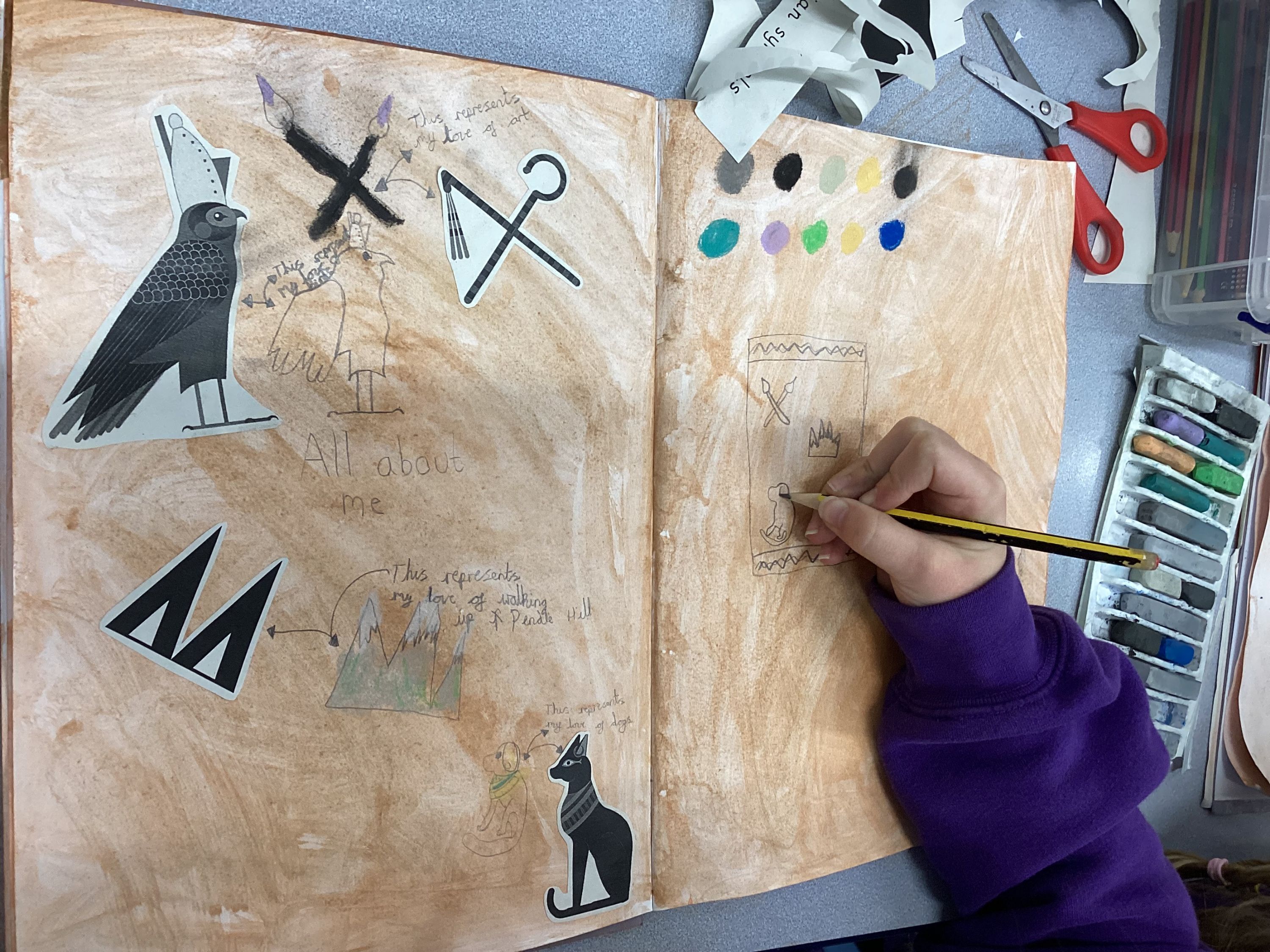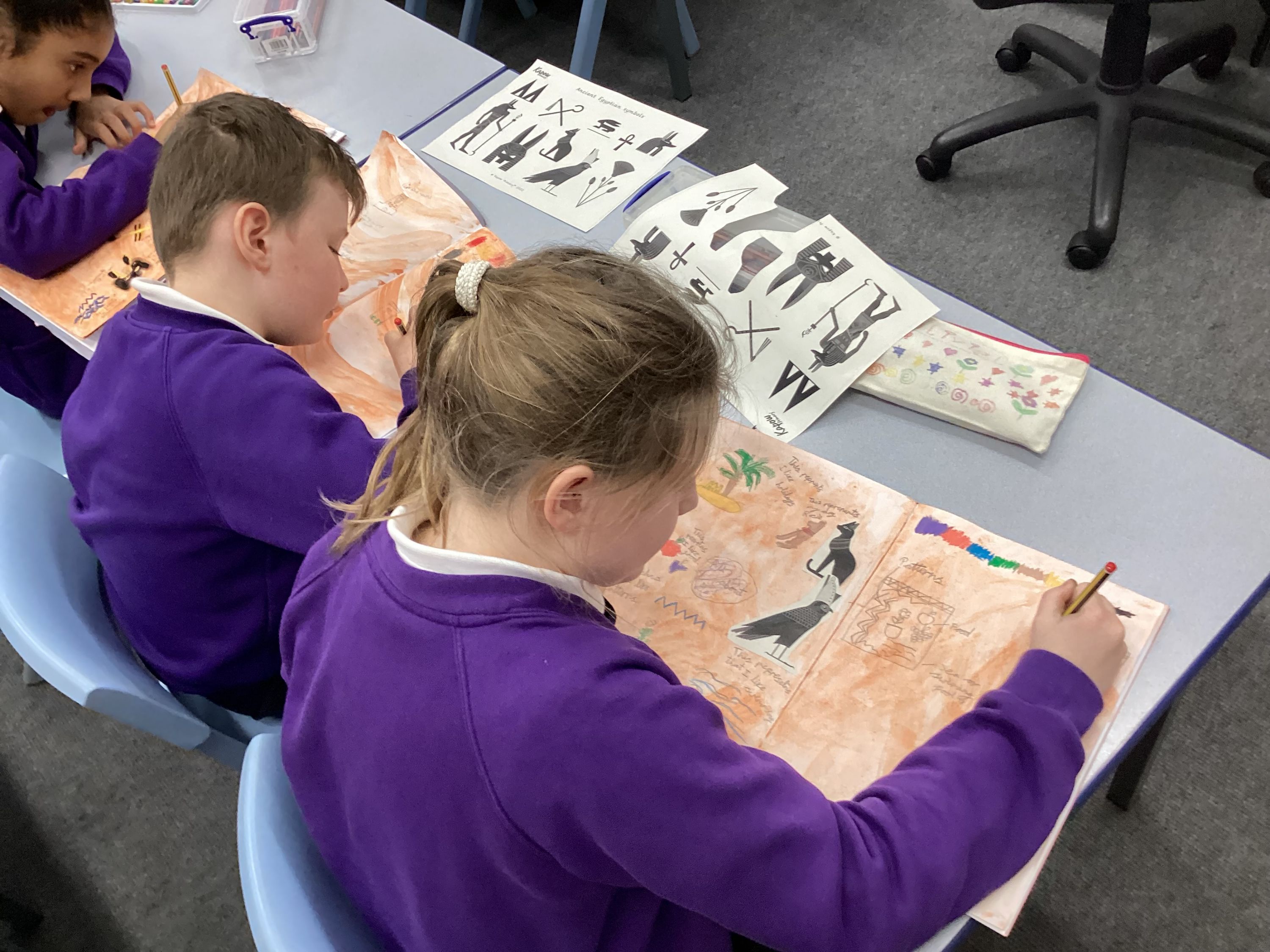 In Art, the children have been busy designing their own Egyptian scrolls. They explored how the Ancient Egyptians used images to communicate important information and thought carefully about how to represent their own ideas using symbols, colour and composition. The class looked closely at the key features of Ancient Egyptian artwork—such as repeated patterns, hieroglyphic-style markings, and the use of profile figures—and used these inspirations to guide their own creative choices. The children have shown fantastic creativity and attention to detail, and we’re looking forward to sharing their completed scrolls with you soon!