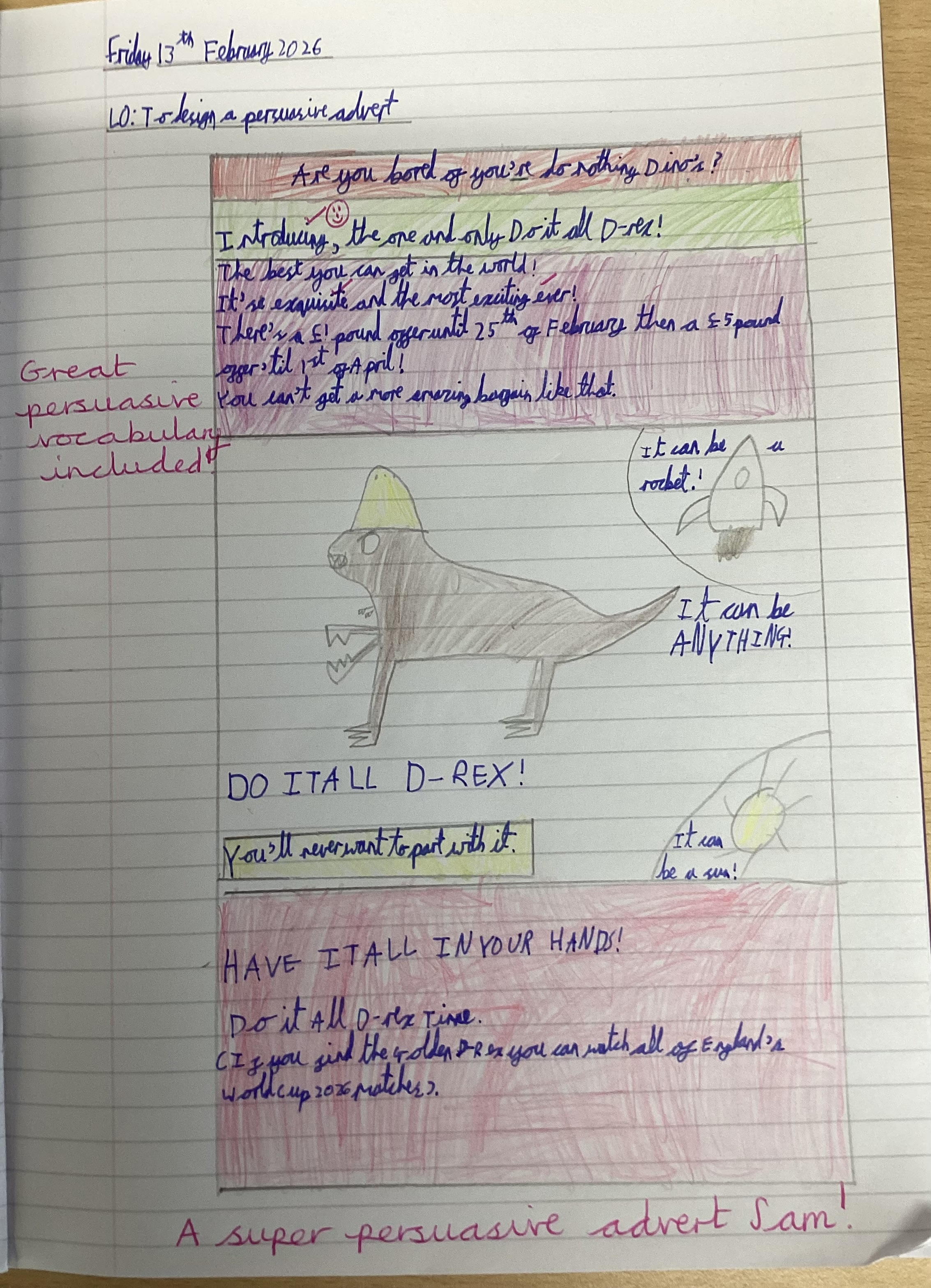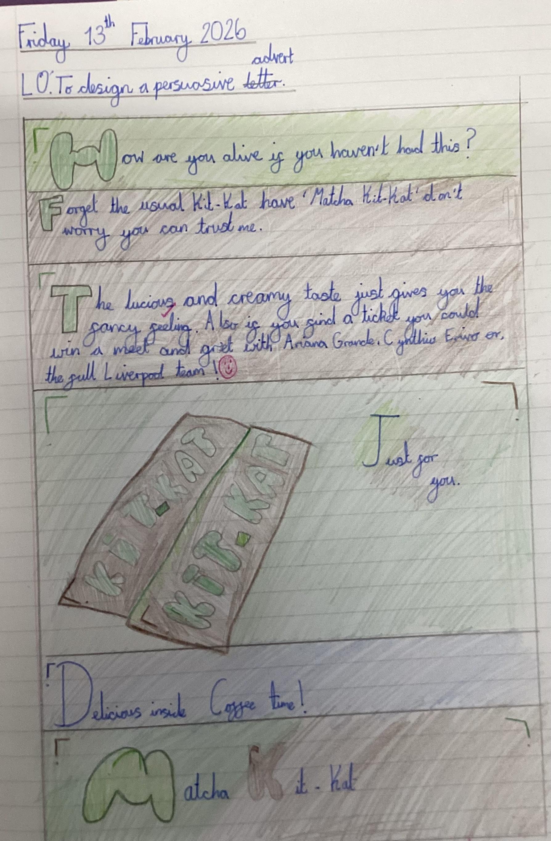 This week in English, we have been learning all about persuasive adverts! The children explored a range of advertising techniques by looking closely at adverts on TV and in magazines. We discussed how advertisers use catchy slogans, powerful images, and persuasive language to make their products appeal to us. After becoming advertising experts, the children had a go at creating their own persuasive adverts. Would you buy our products? We think you just might!