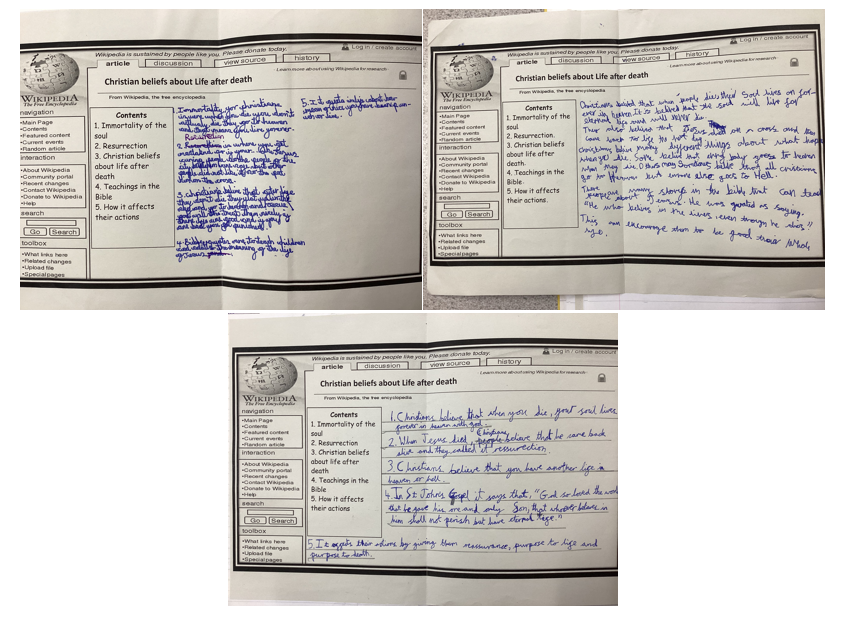 In RE, we took on the role of researchers and created our own Wikipedia-style pages all about Christian beliefs regarding heaven and life after death. The children organised their information carefully, using subheadings and factual writing to explain key ideas clearly. This activity helped deepen our understanding of how Christians view the afterlife and encouraged lots of reflective discussion.
