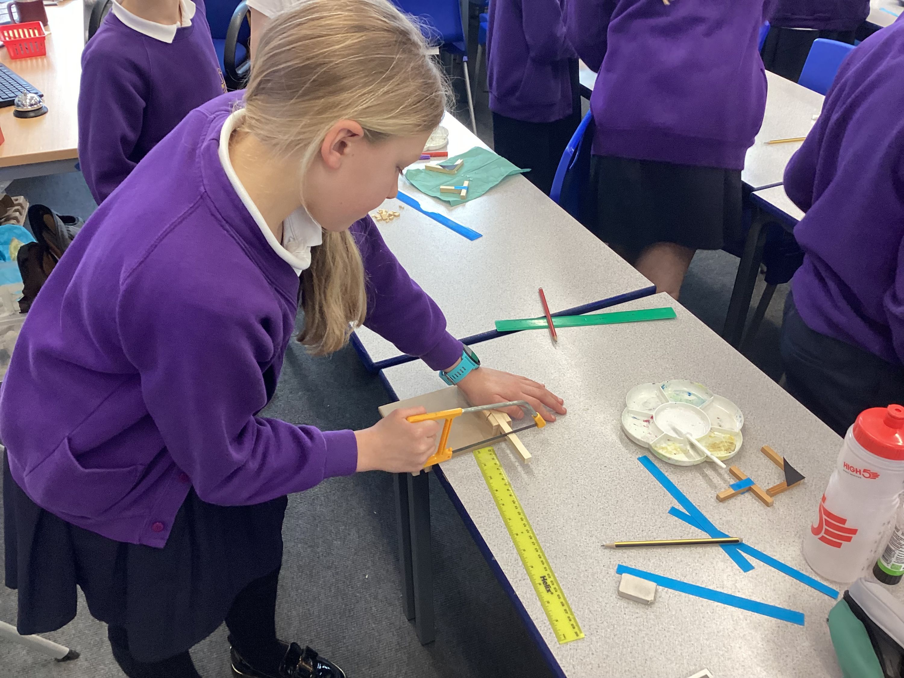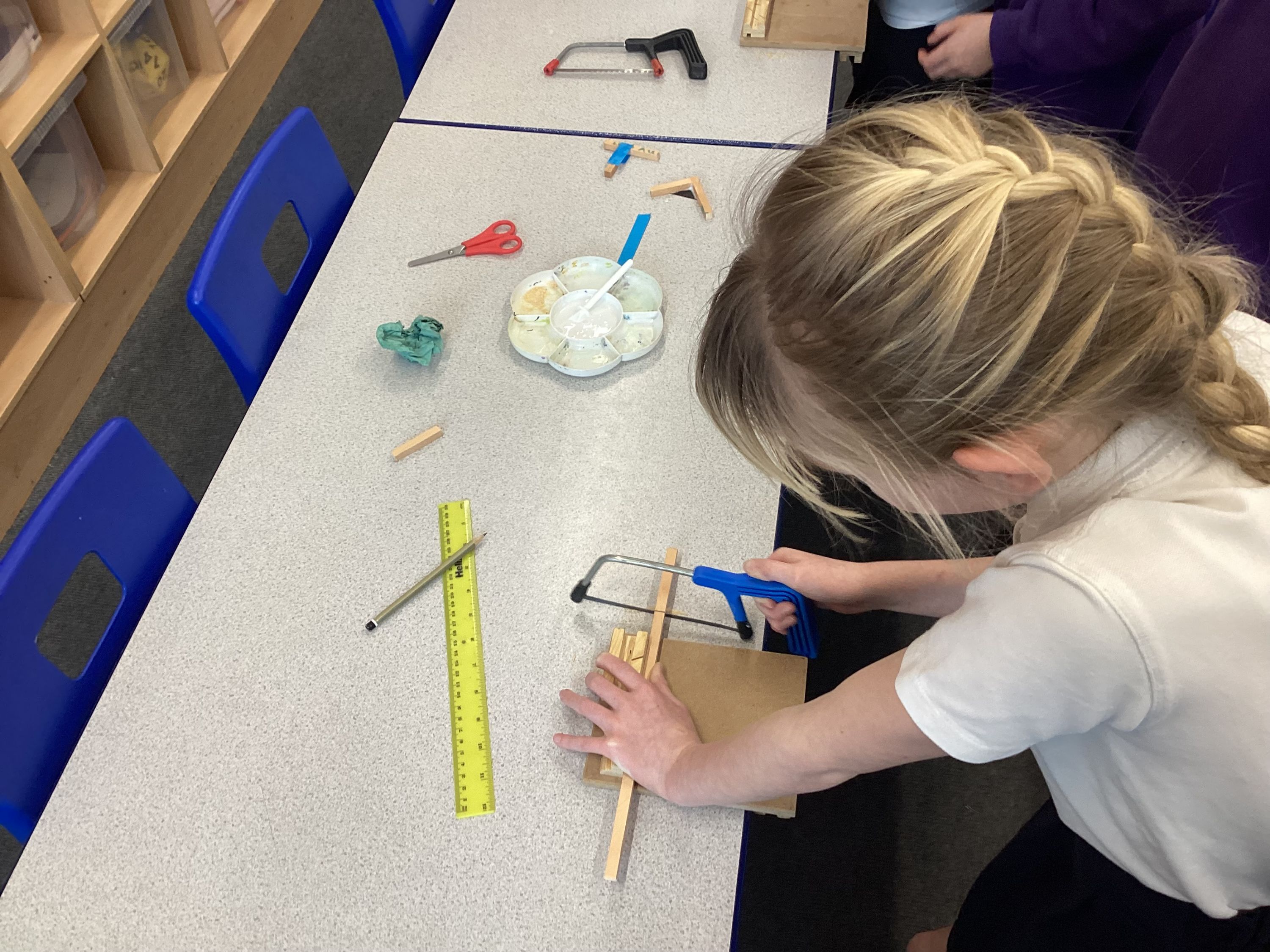 In DT, the children focused on different types of joints, using hacksaws, bench hooks and rulers to carefully measure and cut square-section wood. They created two types of joins—a butt joint and a lap joint—developing both accuracy and confidence with tools.