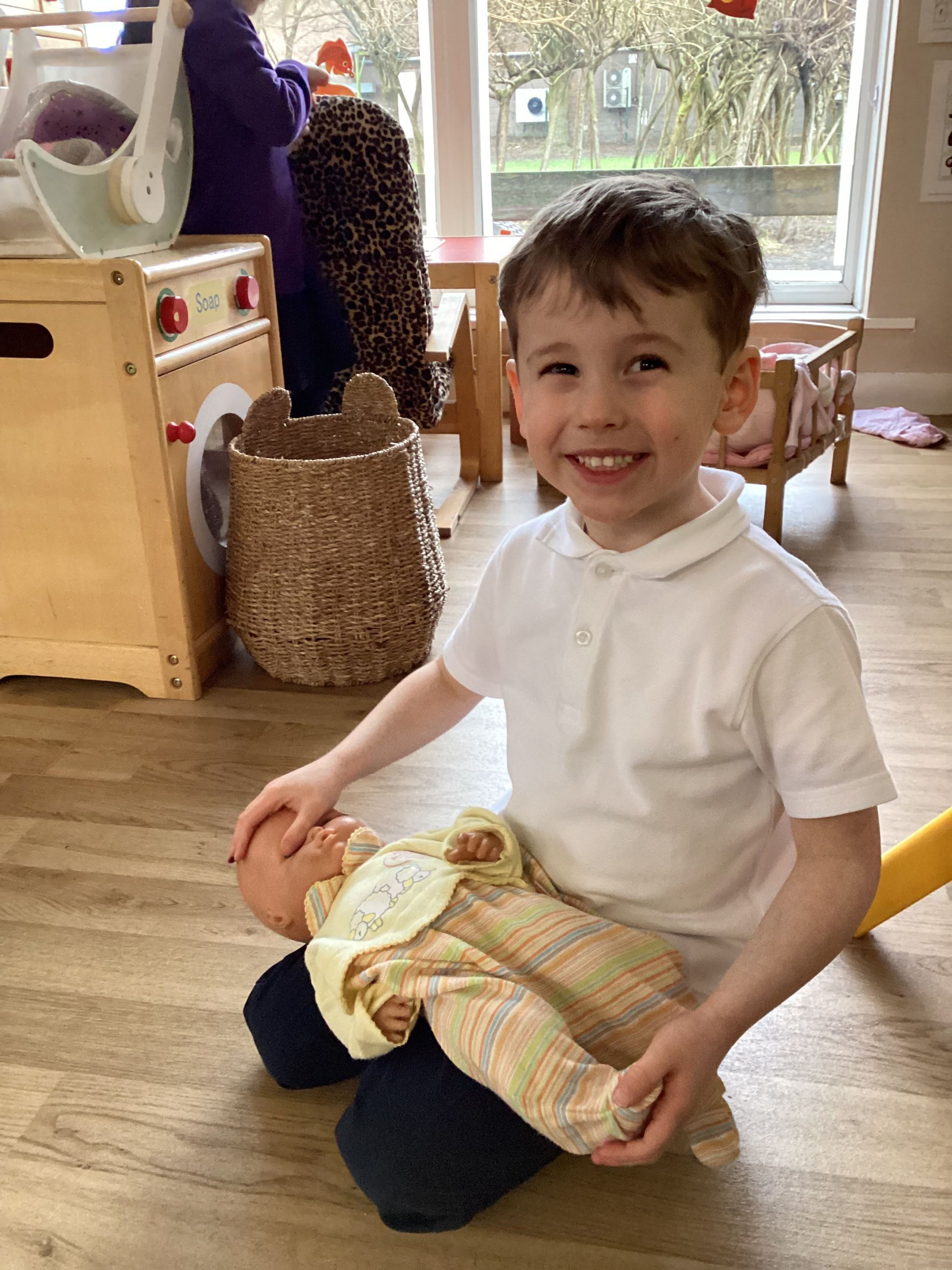 We’ve been practising our fine motor skills this week by dressing the babies in the home corner for the right kind of weather. The children talked about how the baby needed to wrap up warm because it was cold and windy outside, and they worked so carefully to get the dolls’ arms and legs into their clothes. It was a tricky job, but they showed brilliant perseverance and determination throughout!