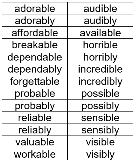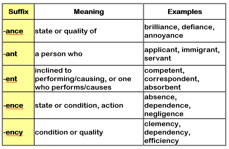words with the endings –ent, -ence, -ency, -ant, -ance, -ancy