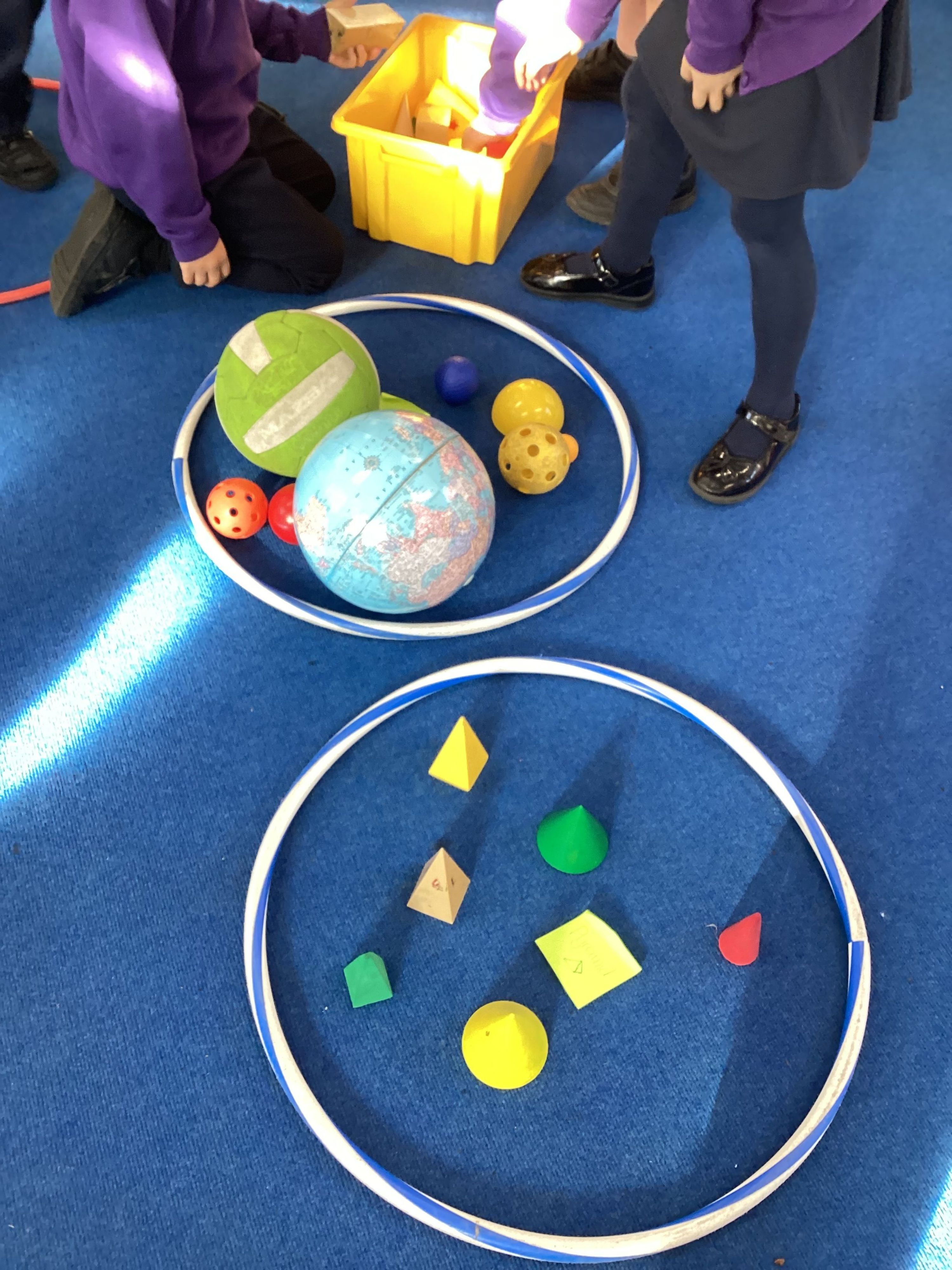 In Maths Year 1s were learning about shapes. We sorted pyramids and spheres. We thought a cone was like a pyramid but it doesn't have any triangle faces.