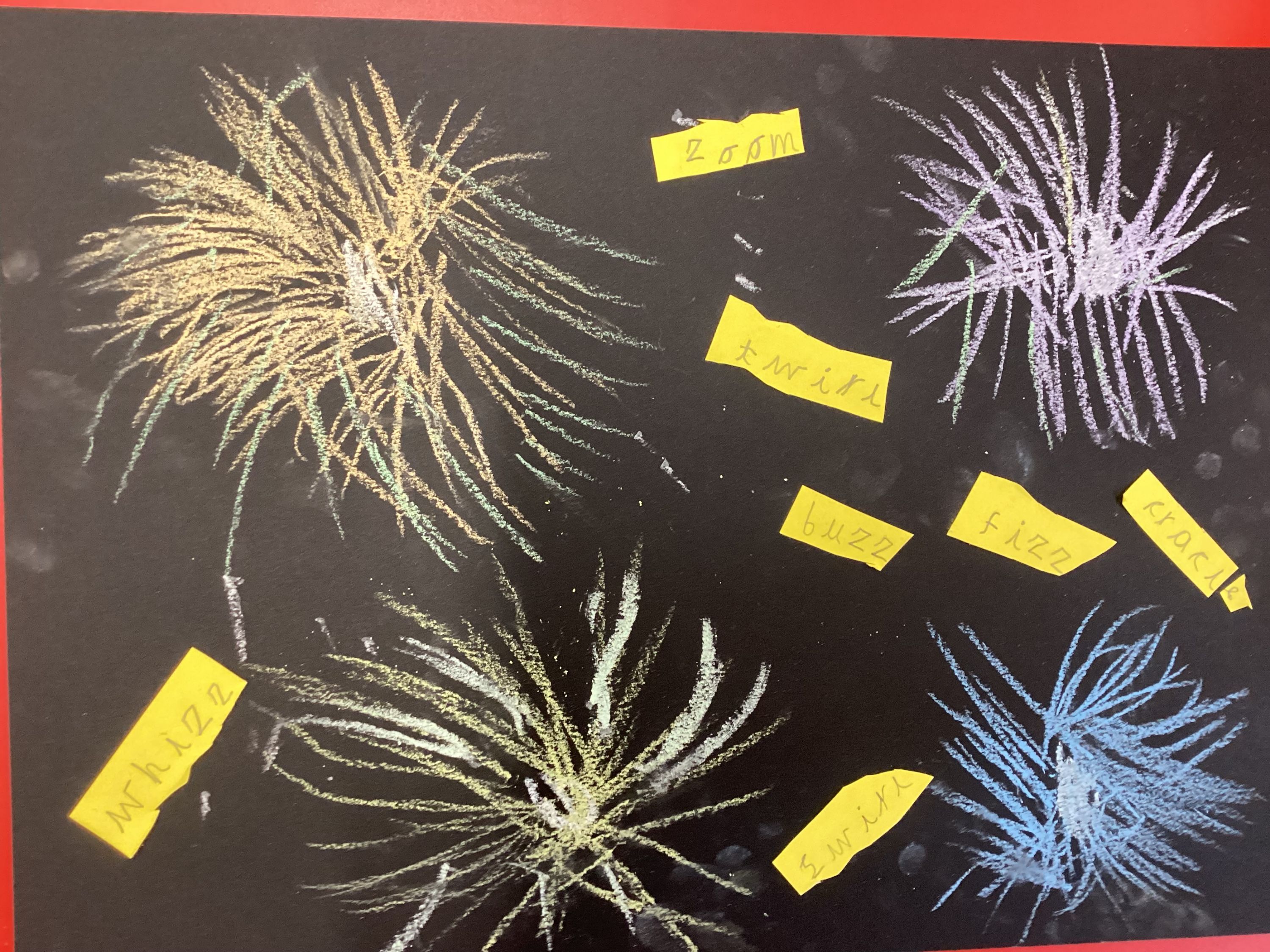 In English, we read a range of Firework Poems. We collated verbs in order to describe the movement and sound of fireworks to help us to innovate a poem.