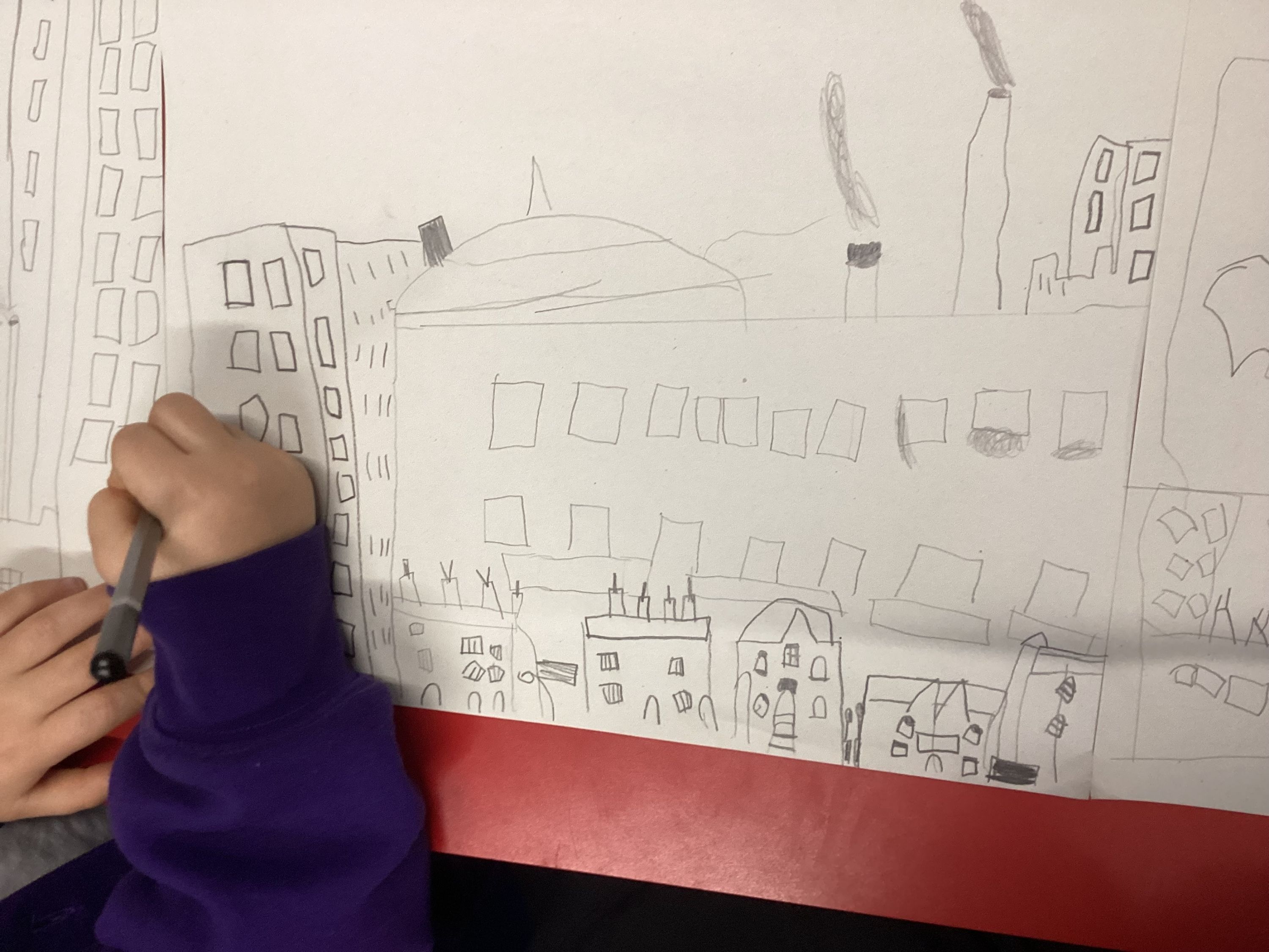 We are studying the artist L. S. Lowry in Art. We worked collaboratively to draw buildings in his style, using tone and shade with sketching pencils.