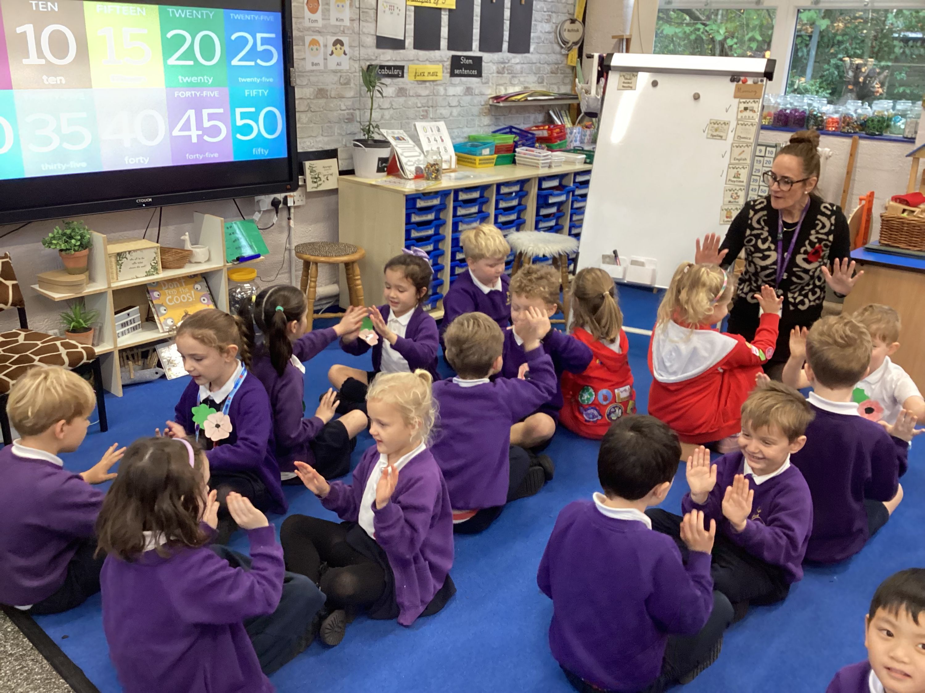 Year 1's were learning how to count in multiples of 2s and 5s in Maths this week. We sang a song, chanted as we marched, hopped, skipped and used our hands with a partner to count in 5s to 60.